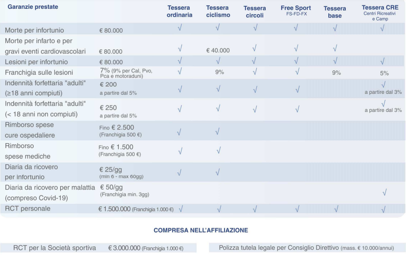 • polizza Responsabilità Civile verso Terzi (R.C.T.), che proteggono il tesserato nel caso in cui venga raggiunto dalla richiesta di risarcimento di un danno involontariamente causato ad altre persone o a cose di proprietà altrui, fino a 1 milione e mezzo di euro.